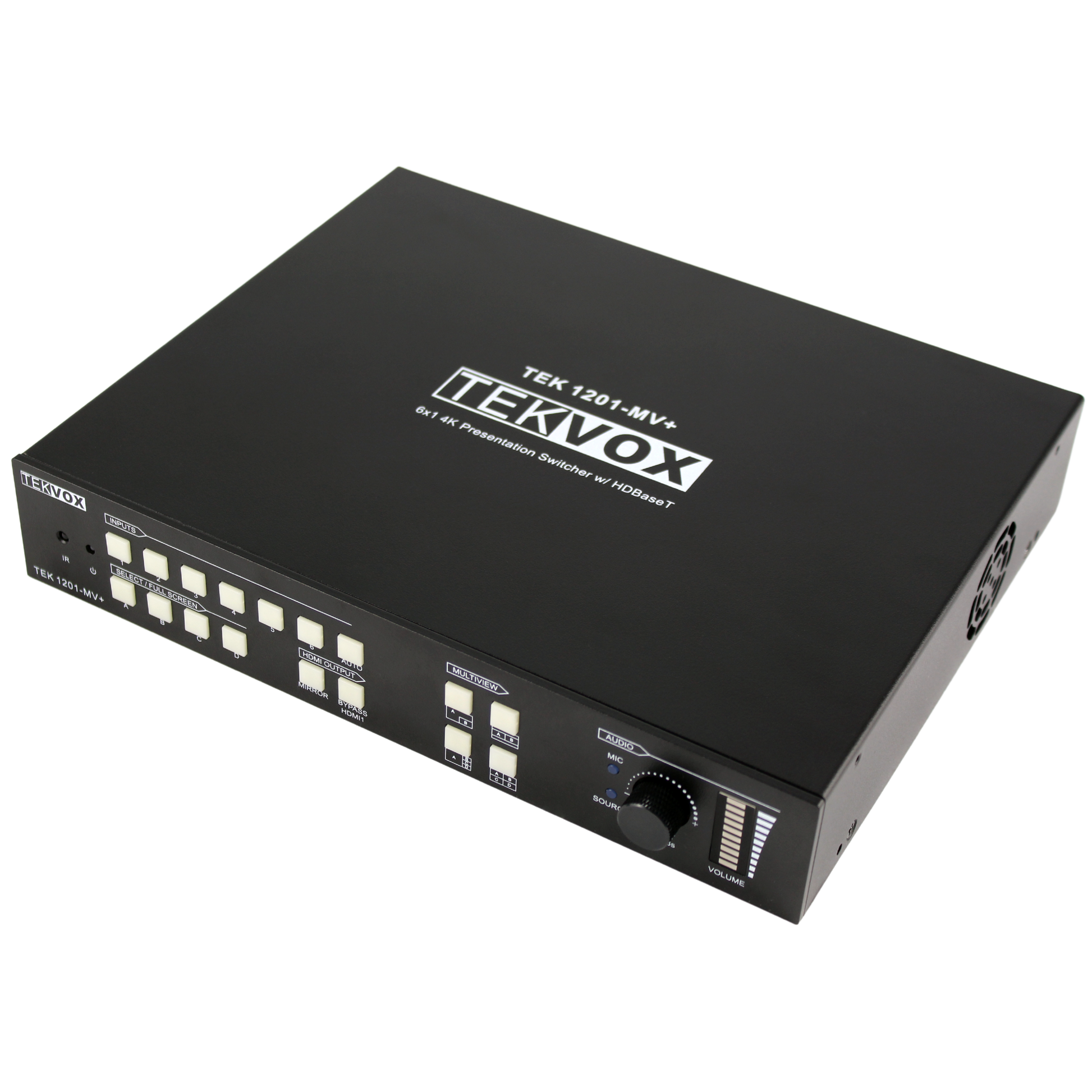 The 1201-MV+ is TEKVOX's most advanced 4K switcher ever, and acts as the heart of our BYOD video conferencing solutions. Packed with advanced features—including flexible multiview, auto-switching, USB bridging via 5-Play HDBaseT, a breakaway HDMI output, and CEC auto-power on—the 1201-MV+ is the ultimate switcher for any number of applications.